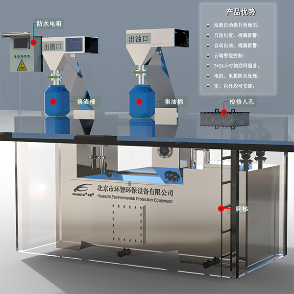 HGYZD-GY-V型由脂分離設(shè)備采用聯(lián)動(dòng)式殘?jiān)嵘夹g(shù),將殘?jiān)鼜牡叵赂粲推鲀?nèi)提升至地上集渣桶內(nèi),有效攔截6mm以上的固體殘?jiān)铮霸O(shè)有桶滿報(bào)警裝置。